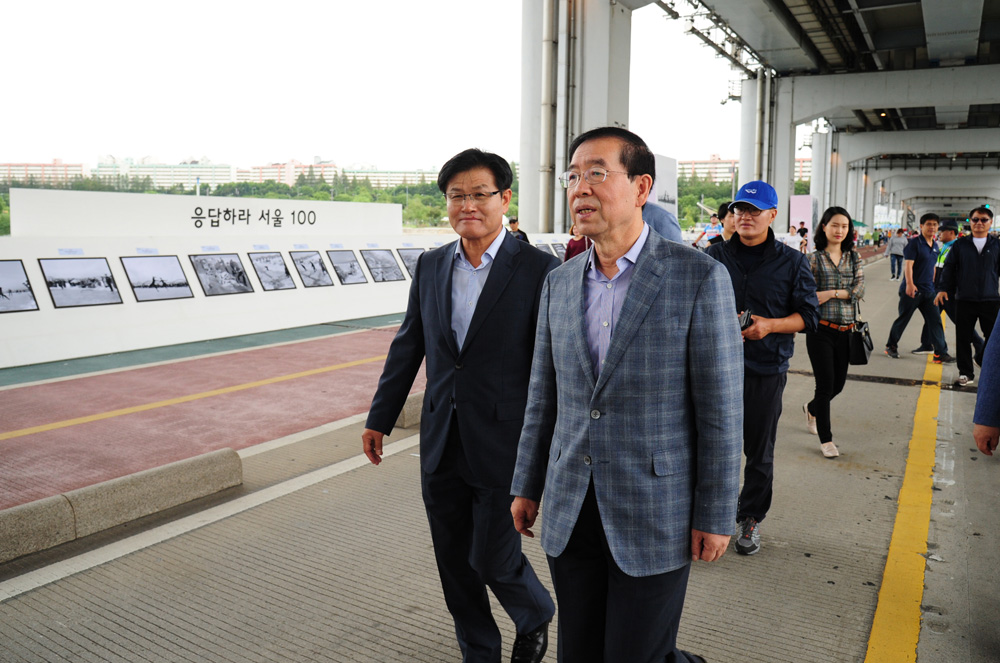 | 사진설명 | 박원순 서울시장이 3일 오후 서울 서초구 반포동 올림픽대로 잠수교와 반포한강공원 일대에서 열린 '2016 한강 다리 축제'를 찾아 소감을 말하고 있다. 한강 인도교 100주년을 기념해 열린 이번 축제는 한강의 관광자원을 개발하고 시민들과 소통하기 위해 오는 4일 오전 4시까지 전면 통제되는 잠수교에서는 60여 명의 연주자가 공연하는 등 강 남북의 예술가와 길꾼들로 가득해 다양한 볼거리를 제공한다. 서울시 제공 |