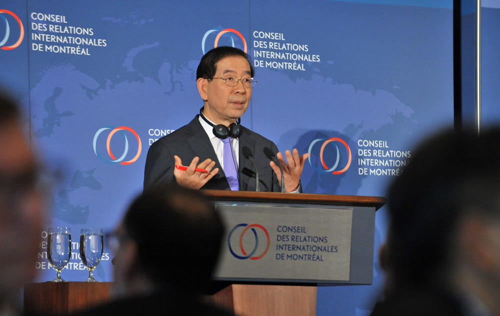 박원순 서울시장이 8일(현지시간) 몬트리올외교협회 초청으로 몬트리올 시내 르 웨스틴 몬트리올 호텔에서 '사회적경제 그리고 도시의 미래'를 주제로 특별 강연을 했다. 서울시 제공