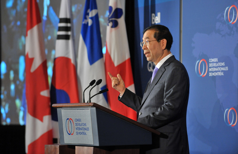 박원순 서울시장이 8일(현지시간) 몬트리올외교협회 초청으로 몬트리올 시내 르 웨스틴 몬트리올 호텔에서 '사회적경제 그리고 도시의 미래'를 주제로 특별 강연을 했다. 서울시 제공