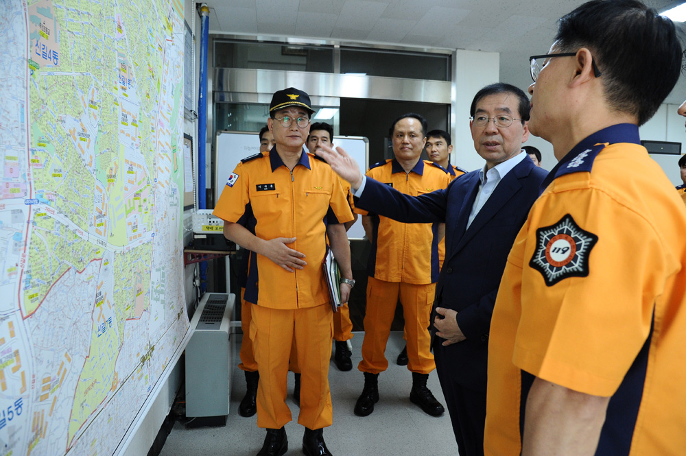 박원순 서울시장이 추석 연휴를 하루 앞둔 13일 오후 서울 영등포소방서 신길119안전센터에 방문해 소방대원들을 격려하고 화재 상황에 대해 설명 듣고 있다. 서울시 제공