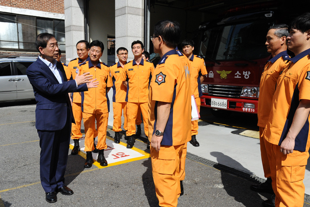 박원순 서울시장이 추석 연휴를 하루 앞둔 13일 오후 서울 영등포소방서 신길119안전센터에 방문해 소방대원들을 격려하고 화재 상황에 대해 설명 듣고 있다. 서울시 제공