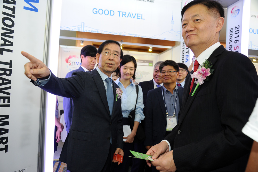 남상만(왼쪽부터) 서울특별시관광협회 회장, 쑤징 UNWTO 아테국장, 박원순 서울시장, 박삼구 한국방문위원회 위원장, 양무승 한국여행업협회 회장이 20일 서울 서대문구 홍은동 그랜드힐튼호텔에서 열린 '2016 서울국제트래블마트(SITM)'에서 파이팅을 외치며 기념촬영을 하고 있다. 서울시 제공