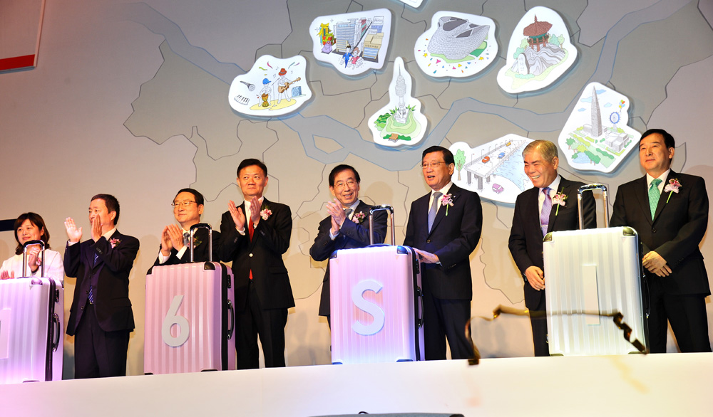 남상만(왼쪽부터) 서울특별시관광협회 회장, 쑤징 UNWTO 아테국장, 박원순 서울시장, 박삼구 한국방문위원회 위원장, 양무승 한국여행업협회 회장이 20일 서울 서대문구 홍은동 그랜드힐튼호텔에서 열린 '2016 서울국제트래블마트(SITM)'에서 파이팅을 외치며 기념촬영을 하고 있다. 서울시 제공