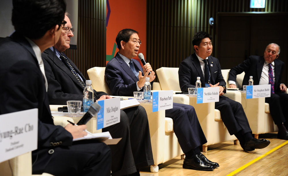 박원순 서울 시장이 22일 오전 서울특별시청 신청사 6층 시장실에서 미국 스탠포드대학 경영대학원 학생 17명을 만나 서울시가 추진하고 있는 혁신정책과 민관거버넌스 성공사례를 소개하고 있다. 서울시 제공