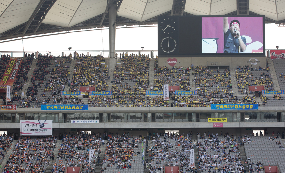 전국의 시중은행들이 소속된 금융노조가 성과연봉제 도입 반대와 관치금융 철폐를 요구하며 총파업에 돌입한 23일 오전 서울 마포구 서울월드컵경기장에서 전국금융산업노동조합(금융노조) 조합원들이 성과연봉제 저지 총파업 결의대회를 진행하고 있다.