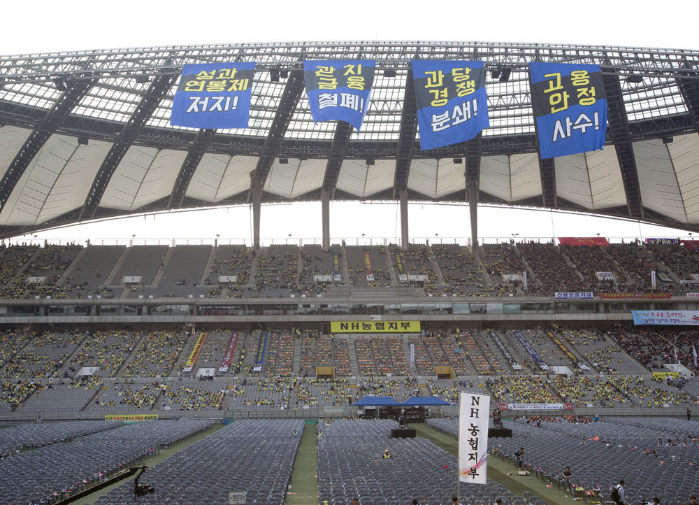 전국의 시중은행들이 소속된 금융노조가 성과연봉제 도입 반대와 관치금융 철폐를 요구하며 총파업에 돌입한 23일 오전 서울 마포구 서울월드컵경기장에서 전국금융산업노동조합(금융노조) 조합원들이 성과연봉제 저지 총파업 결의대회를 진행하고 있다.