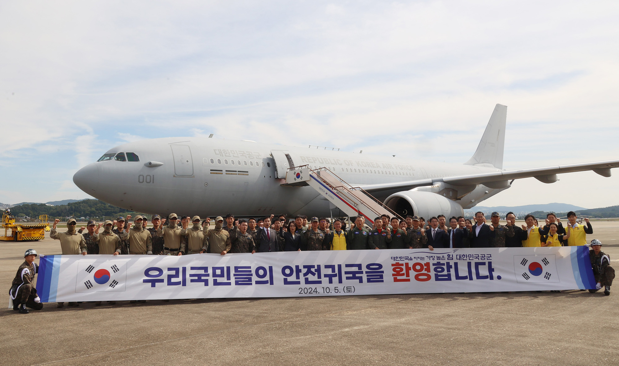 김선호 국방부 차관과 강인선 외교부 2차관이 5일 오후 경기도 성남 서울공항에서 레바논에 체류 중이던 재외국민과 가족을 무사 귀국시킨 외교부 신속대응팀, 군 의무요원을 격려하며 기념촬영을 하고 있다. 이날 레바논에 체류 중이던 재외국민과 가족 97명이 귀국했다. <2024. 10. 5 사진공동취재단> |