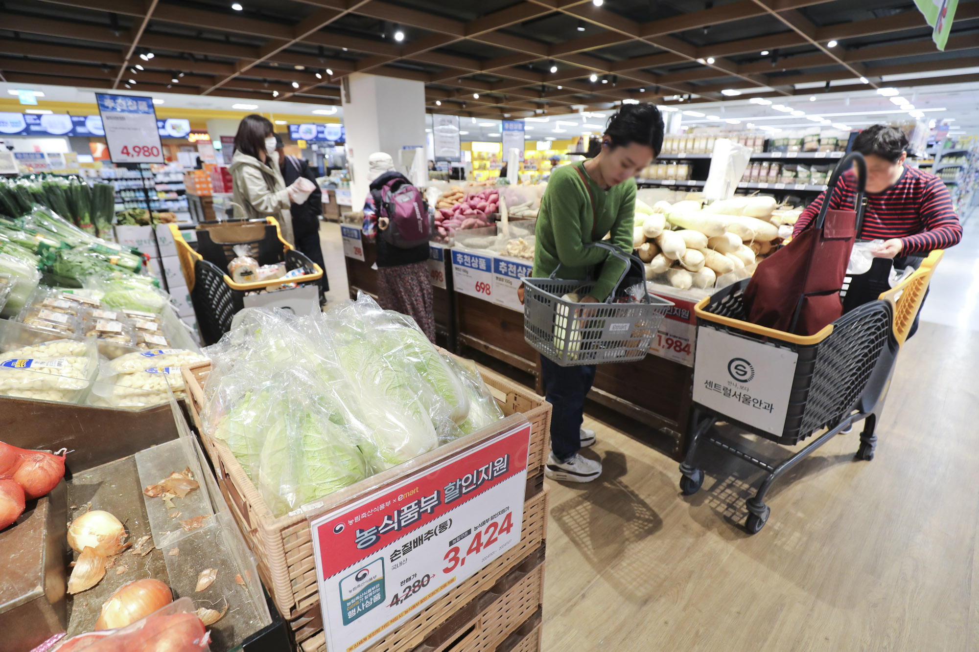 [서울=eoimage] 박정훈 기자 = 5일 통계청이 발표한 소비자물가 동향에 따르면 김장철을 앞두고 김치의 주재료인 배추(51.5%), 무(52.1%) 등 채소가 50% 넘게 뛰었고 상추도 49.3% 올랐다고 발표했다. 6일 오후 서울 용산구 대형마트에 시민들이 배추, 무 등을 고르고 있다. 이날 농식품부 할인지원으로 손질배추 한포기 3,424원 무 한개 1,984원에 판매중이다. 2024.11.6. |