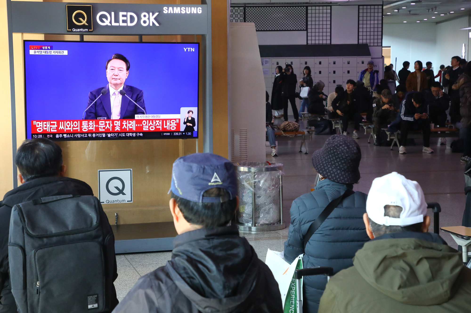 7일 서울 중구 서울역 대합실에서 텔레비전 생중계되는 윤석열 대통령의 대국민 담화·기자회견을 시민들이 지켜보고 있다.( 사진 사용시 행인 인물 모자이크 요망.) 2024.11.07 사진/임준선기자