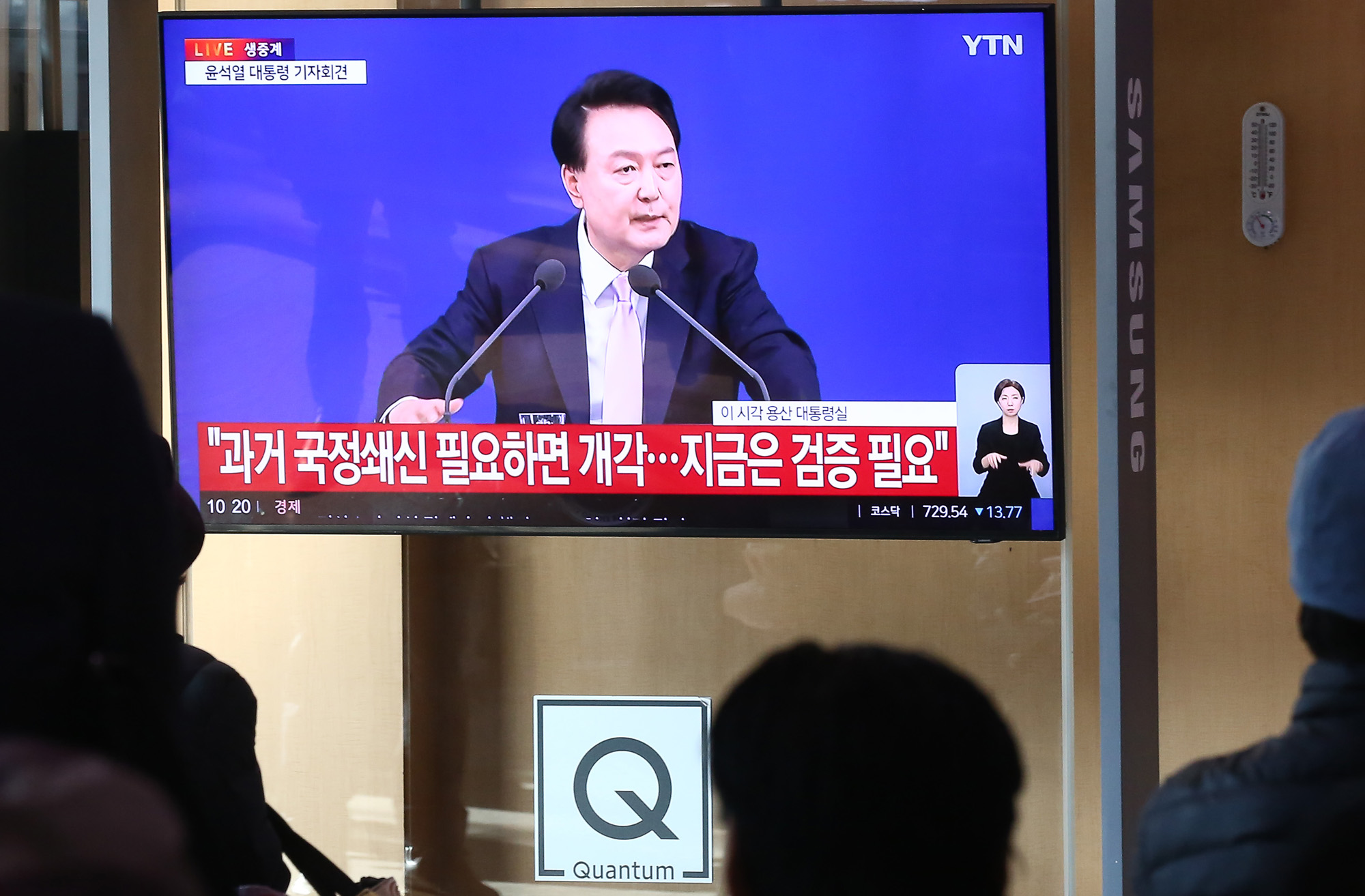 7일 서울 중구 서울역 대합실에서 텔레비전 생중계되는 윤석열 대통령의 대국민 담화·기자회견을 시민들이 지켜보고 있다.( 사진 사용시 행인 인물 모자이크 요망.) 2024.11.07 사진/임준선기자