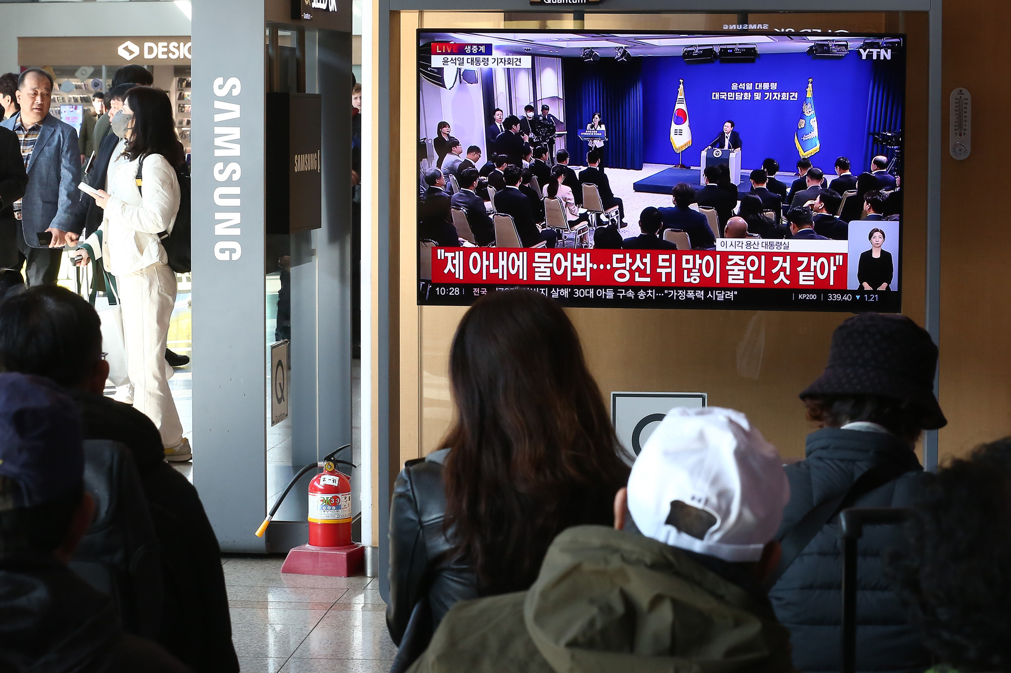 7일 서울 중구 서울역 대합실에서 텔레비전 생중계되는 윤석열 대통령의 대국민 담화·기자회견을 시민들이 지켜보고 있다.( 사진 사용시 행인 인물 모자이크 요망.) 2024.11.07 사진/임준선기자