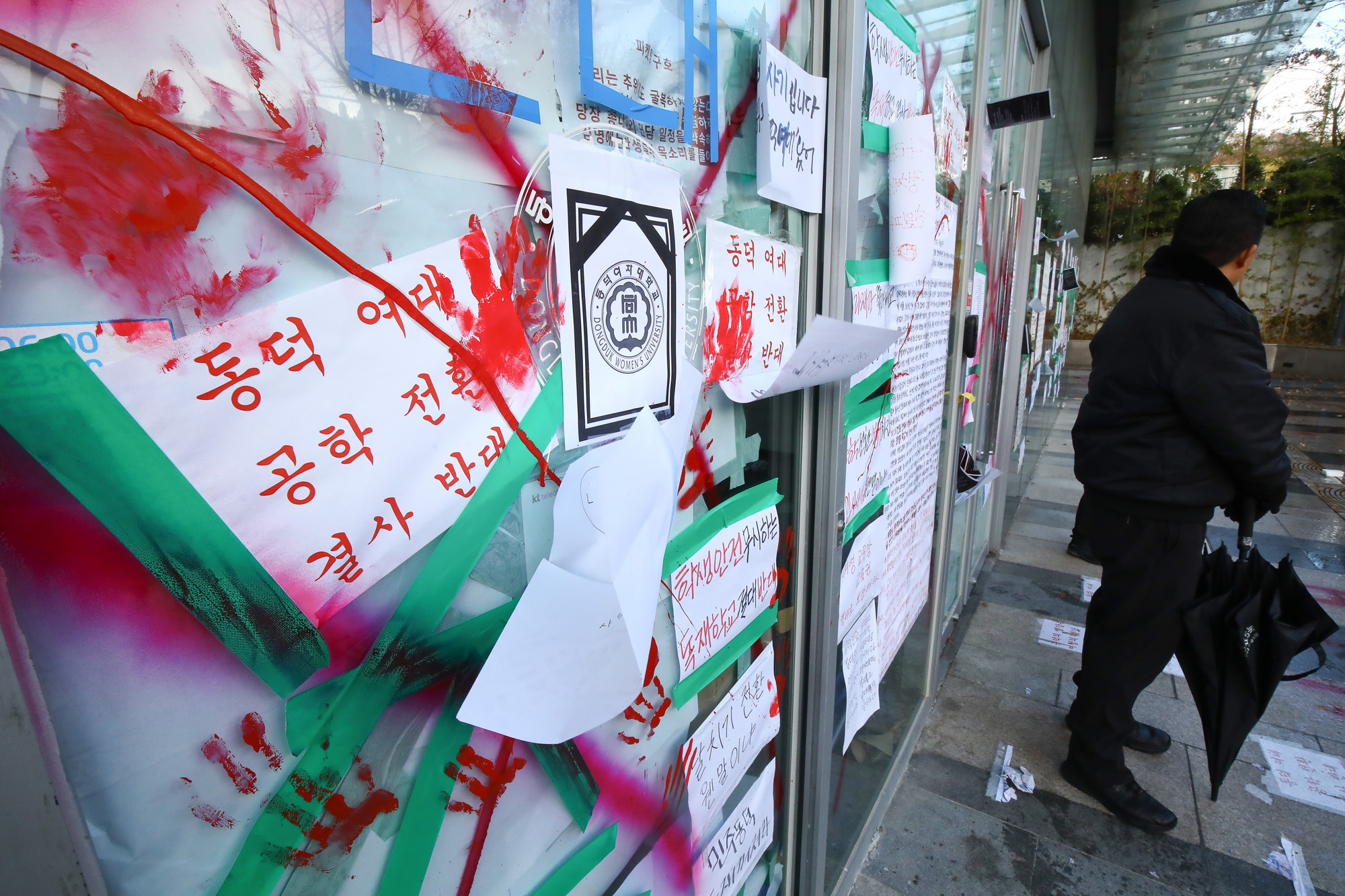 [서울=eoimage] 임준선 기자 =26일 서울 성북구 동덕여대 캠퍼스에 남녀공학 전환 반대를 주장하는 래커칠이 돼있다.(사진 사용시 인물 초상권 유의 바랍니다.) 2024.11.26