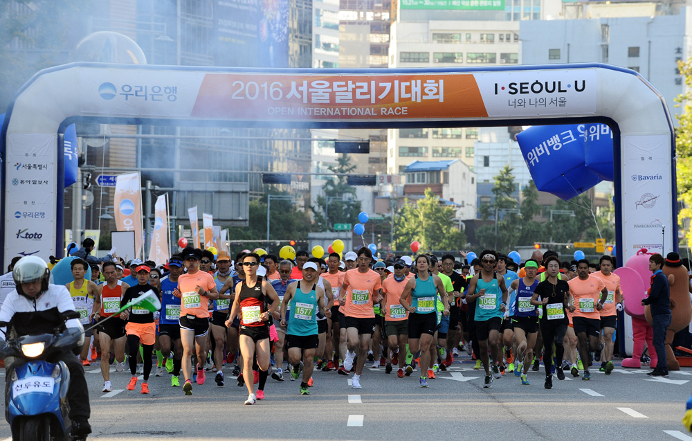 박원순 서울시장이 9일 오전 8시 서울광장에서 일반 시민, 마라톤 동호인, 외국인 등 1만여명이 참여하는 '2016 서울달리기 대회'에 참석하고 있다. 서울시 제공