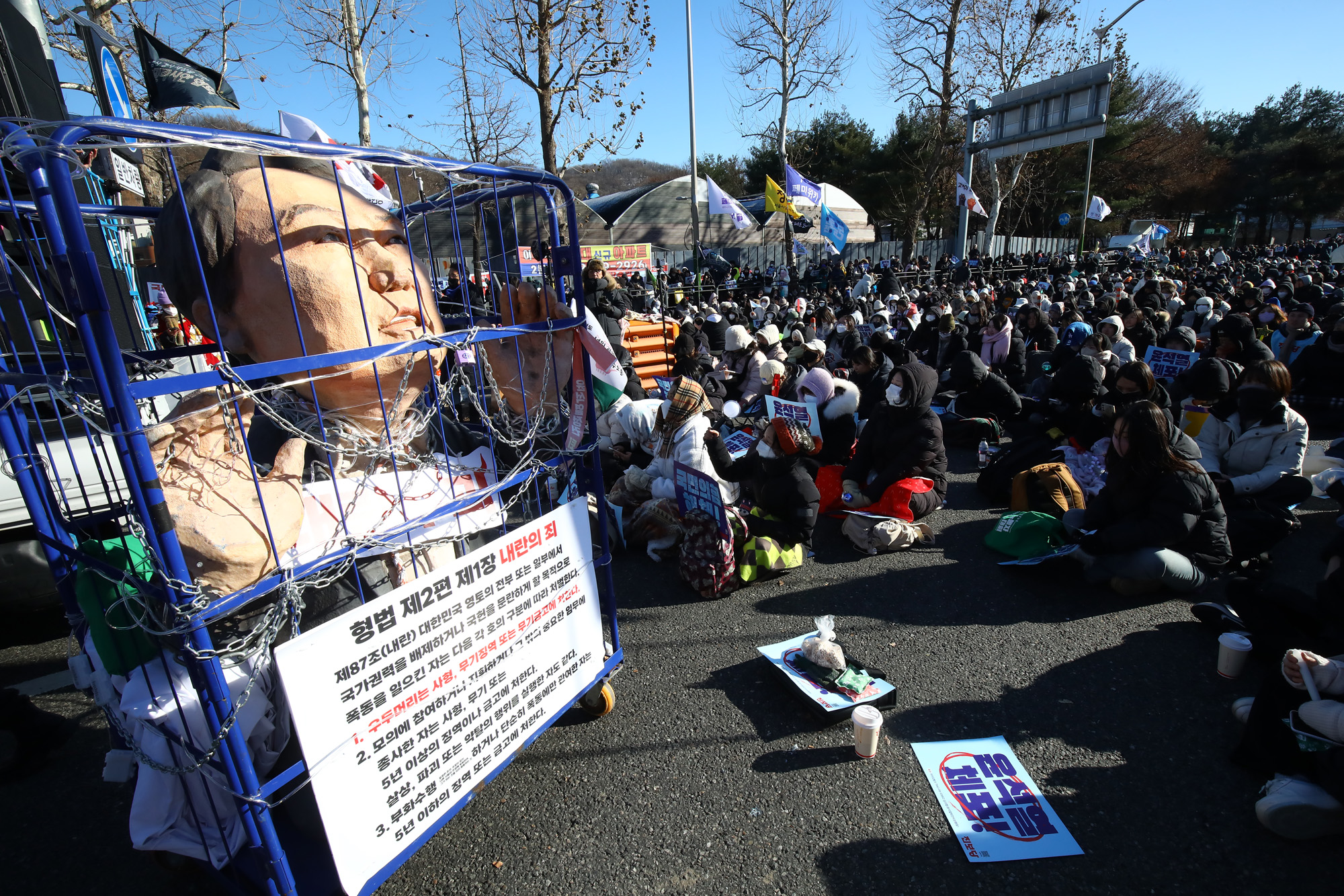 [서울=eoimage] 임준선 기자 = 22일 오후 서울 서초구 남태령에서 열린 '윤석열 대통령 체포·구속 농민 행진 보장 촉구 시민대회'에서 전국농민회총연맹 전봉준 투쟁단 및 시민들이 구호가 적힌 피켓을 들고 있다. 2024.12.22