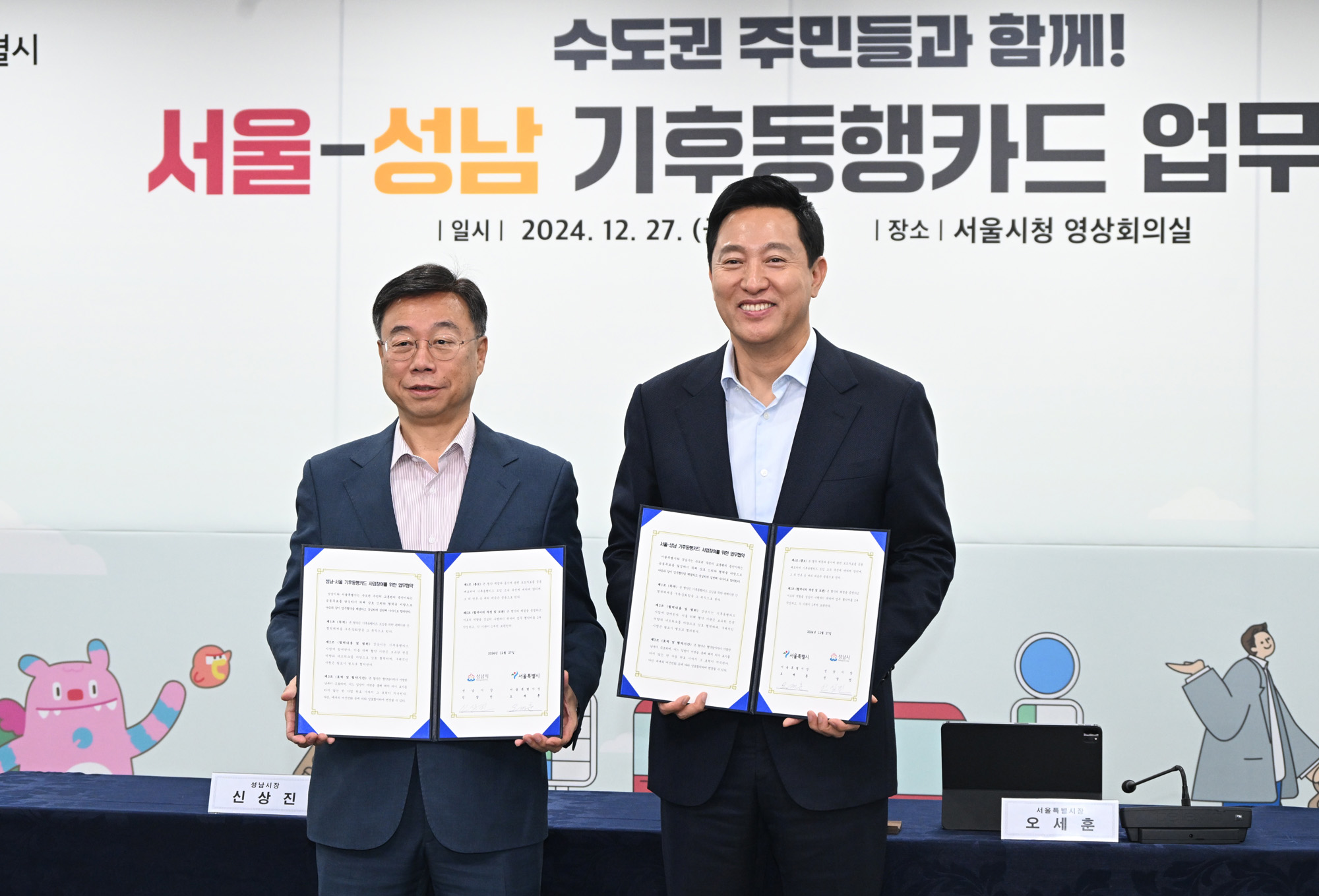 서울시는 12.27.(금) 오전 10시 서울시청(6층 영상회의실)에서 <서울시-성남시 ‘기후동행카드’ 사업 참여 업무협약>을 맺고 오세훈 서울시장과 신상진 성남시장이 양 도시 간 광역교통 협력체계 강화를 위한 논의를 나눴다. 서울시 제공