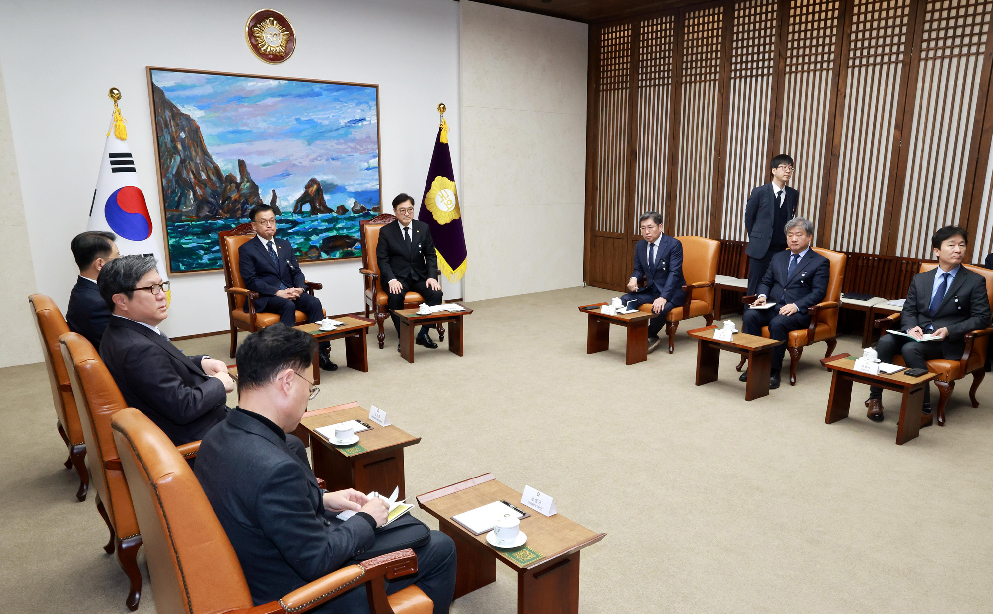 우원식 국회의장(오른쪽)과 최상목 대통령 권한대행 부총리 겸 기획재정부 장관이 30일 국회에서 만나 면담하고 있다.