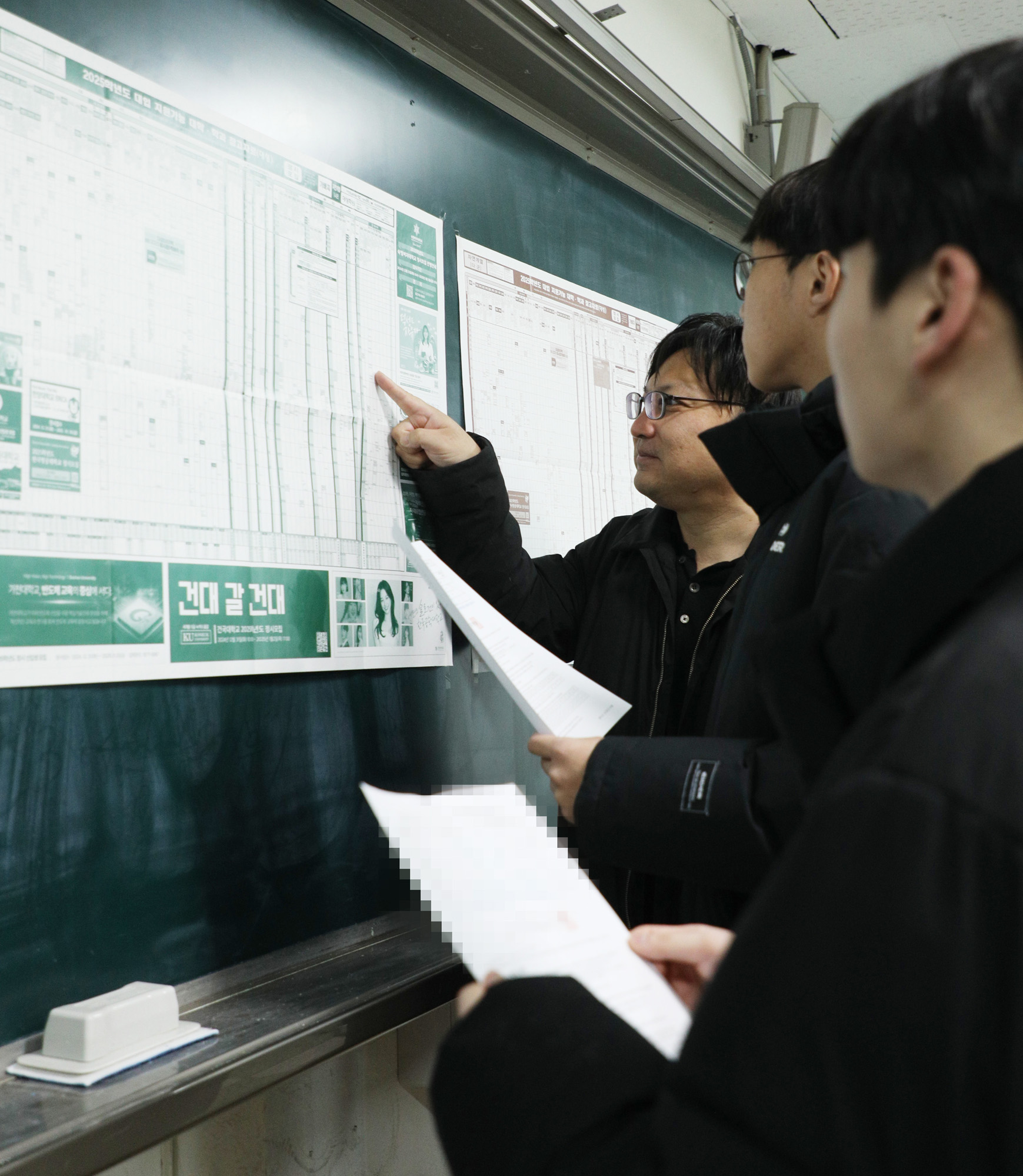 2025학년도 대학수학능력시험(수능) 성적표가 배부된 6일 서울 종로구 동성고등학교에서 고3 담임 선생님이 수험생들과 지원 가능 대학 배치표를 살펴보고 있다. 2024. 12. 6 사진공동취재단 *초상권 모두 허락 받았습니다. 자세히 나온 성적표는 모두 모자이크 처리 필요합니다. |