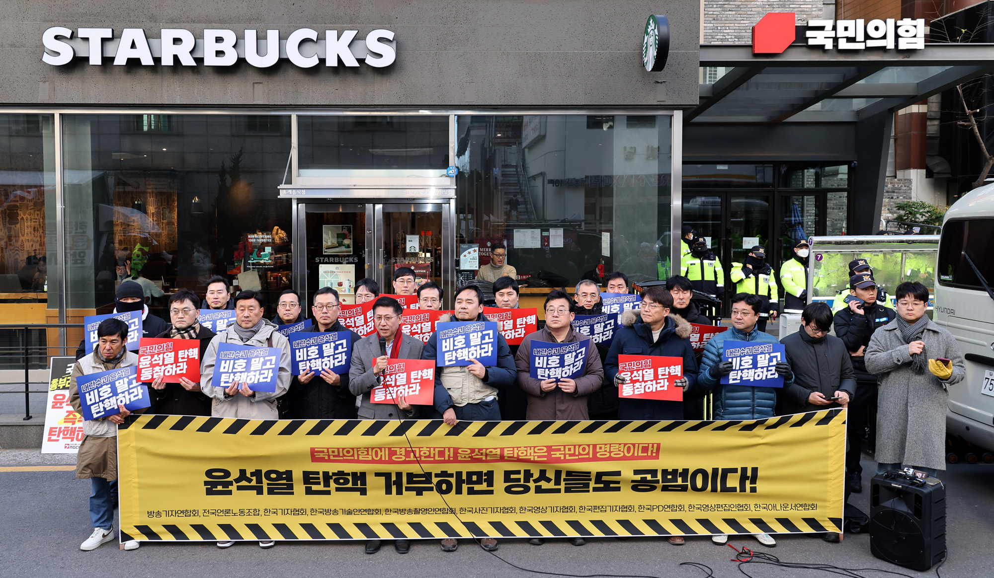 | 사진설명 | 언론현업 11개 단체가 6일 오후 서울 여의도 국민의힘 당사 앞에서 긴급 기자회견을 열고 윤석열 대통령의 탄핵에 국민의힘이 동참할 것을 촉구하고 있다. 이날 회견에는 방송기자연합회, 전국언론노조, 한국기자협회, 한국방송기술인연합회, 한국방송촬영인연합회, 한국사진기자협회, 한국아나운서연합회, 한국영상기자협회, 한국영상편집기자협회, 한국편집기자협회, 한국PD연합회가 참석했다. (2024.12.06) |