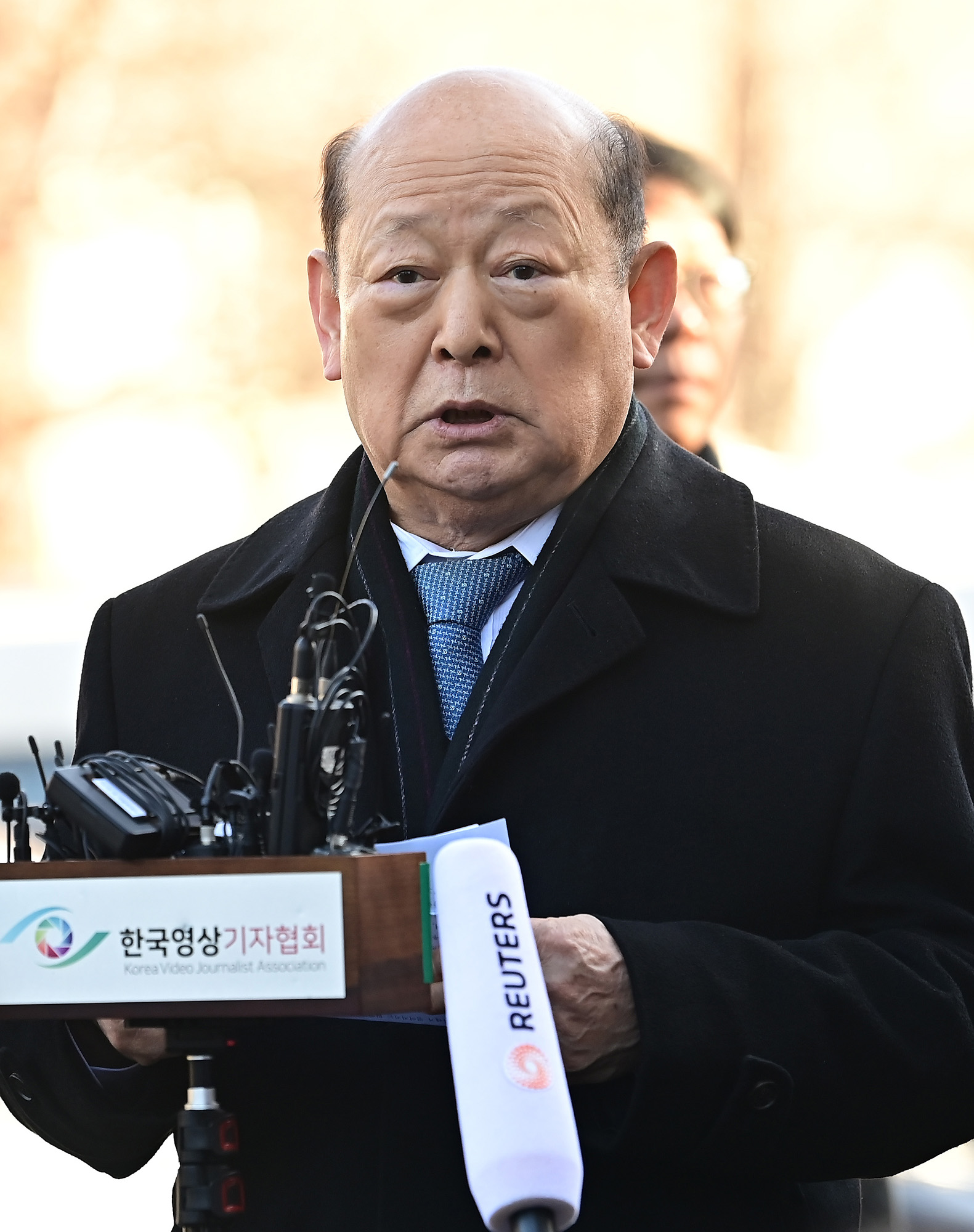 국회 측 탄핵소추대리인단 공동대표인 송두환 전 국가인권위원장이 13일 오전 서울 종로구 헌법재판소에서 열리는 탄핵 심판 8차 변론기일에 출석해 입장을 밝히고 있다. 2025.02.13 사진공동취재단