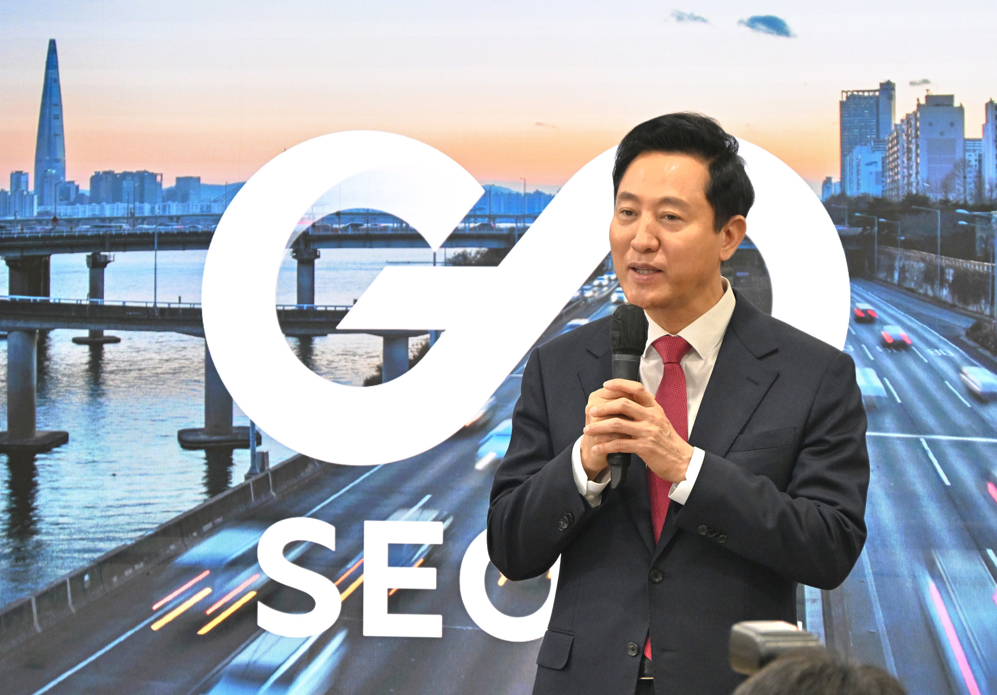 오세훈 서울시장이 24일(월) 오전 서울시청에서 서울시의 교통수단 통합브랜드 발표하고 있다. 서울시 제공