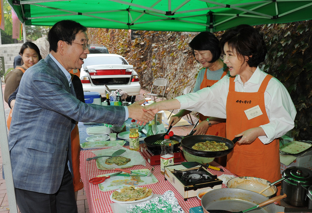 박원순 서울시장이 16일 오후 서울 이화여고 류관순기념관에서 사단법인 사랑의 친구들 주최로 열린 '사랑나누기 바자 한마당'를 찾아 상인들과 대화를 하고 있다. 서울시 제공