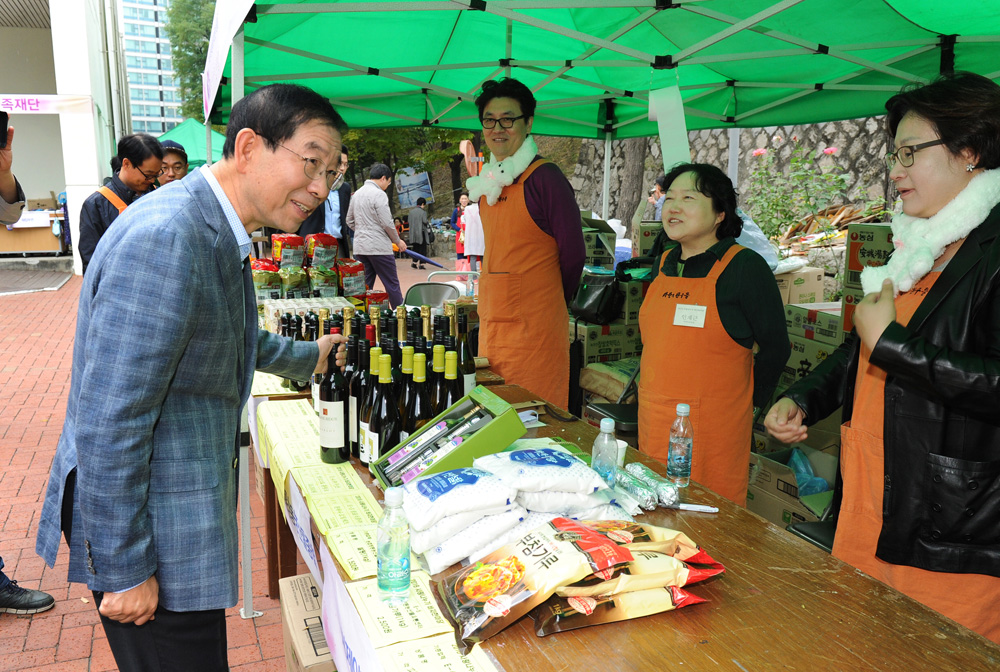 박원순 서울시장이 16일 오후 서울 이화여고 류관순기념관에서 사단법인 사랑의 친구들 주최로 열린 '사랑나누기 바자 한마당'를 찾아 상인들과 대화를 하고 있다. 서울시 제공