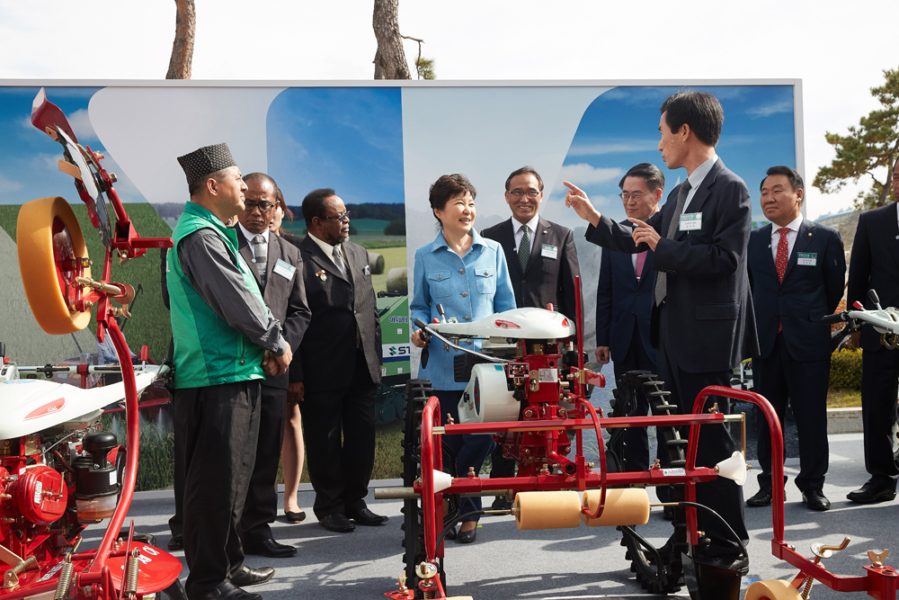 박근혜 대통령이 18일 오전 강원도 평창 알펜시아에서 열린 2016 지구촌 새마을지도자 대회 개막식을 마친 뒤 전시관을 참관하고 있다.