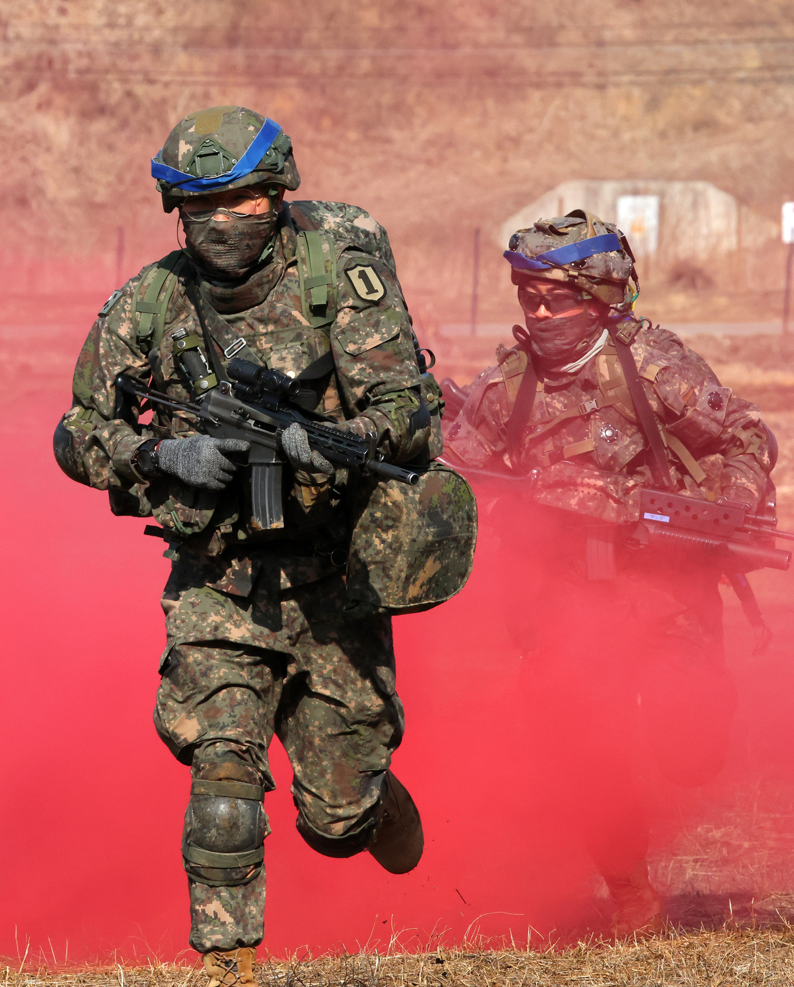 | 사진설명 | 11일 경기 파주시 법원읍 무건리 훈련장에서 열린 ‘한미 연합 공중강습 훈련’을 위해 전개한 가운데 한미 장병들이 목표지역 점령을 하기 위해 전술기동 훈련을 하고 있다. 이날 훈련에는 한국군 90여 명, 미군100여명 참가했으며 수리온 6대가 동원됐다. 2025.03.11 사진공동취재단 |