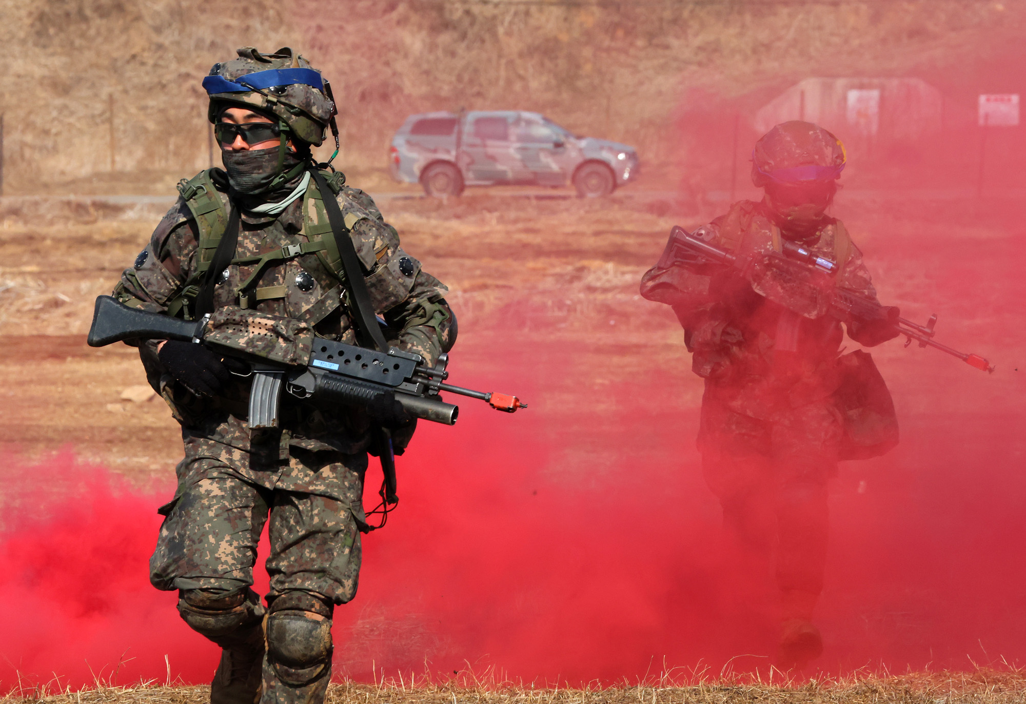 | 사진설명 | 11일 경기 파주시 법원읍 무건리 훈련장에서 열린 ‘한미 연합 공중강습 훈련’을 위해 전개한 가운데 한미 장병들이 목표지역 점령을 하기 위해 전술기동 훈련을 하고 있다. 이날 훈련에는 한국군 90여 명, 미군100여명 참가했으며 수리온 6대가 동원됐다. 2025.03.11 사진공동취재단 |