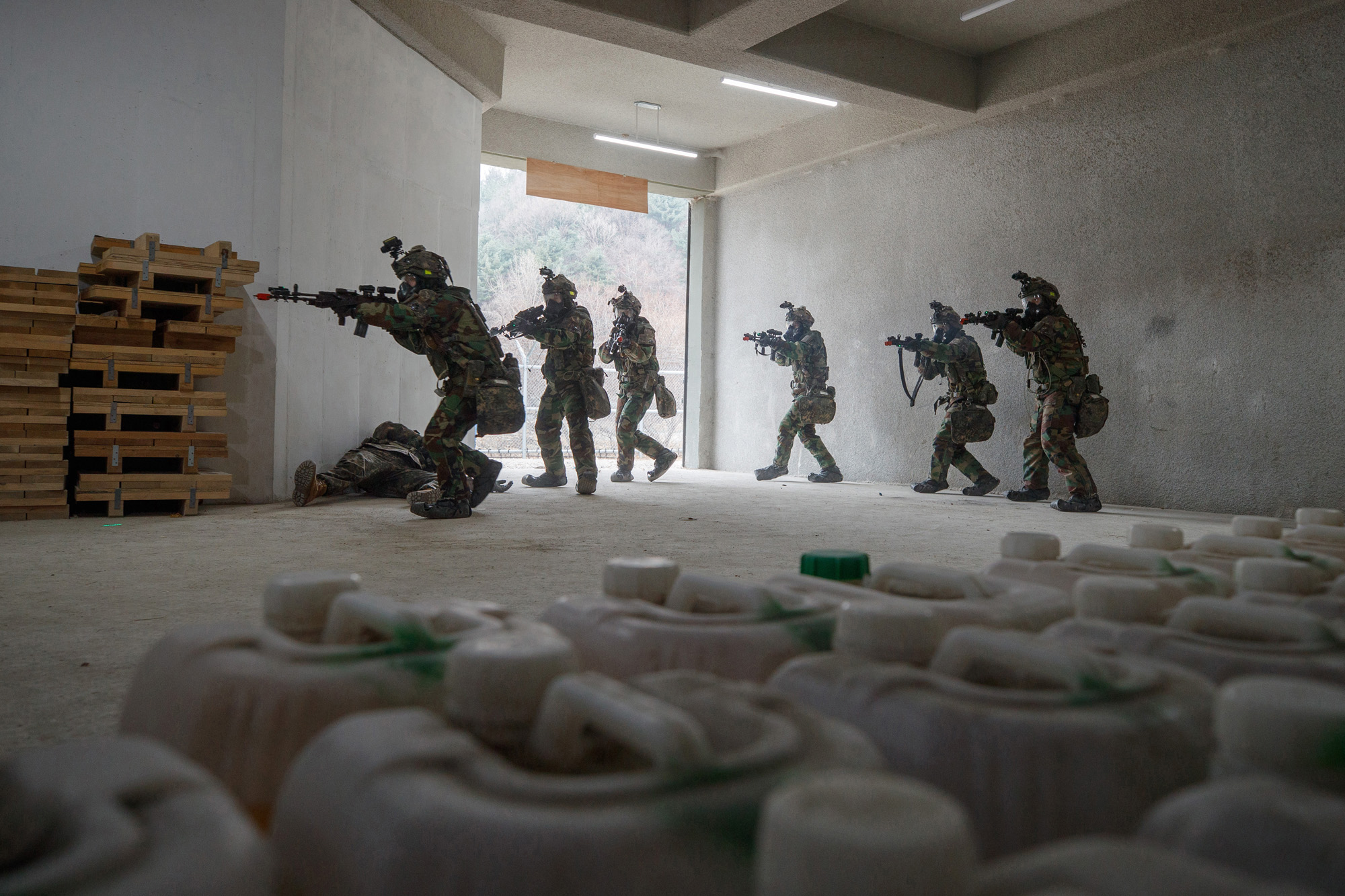 12일 경기 파주시 무건리 훈련장에서 2025 FS/TIGER 일환으로 실시된 유무인 복합전투체계 활용 '한미연합 WMD(대량살상무기) 제거훈련'에서 25사단 장병들이 시설을 정찰 및 확보하고 있다. <2025. 03.12 사진공동취재단>