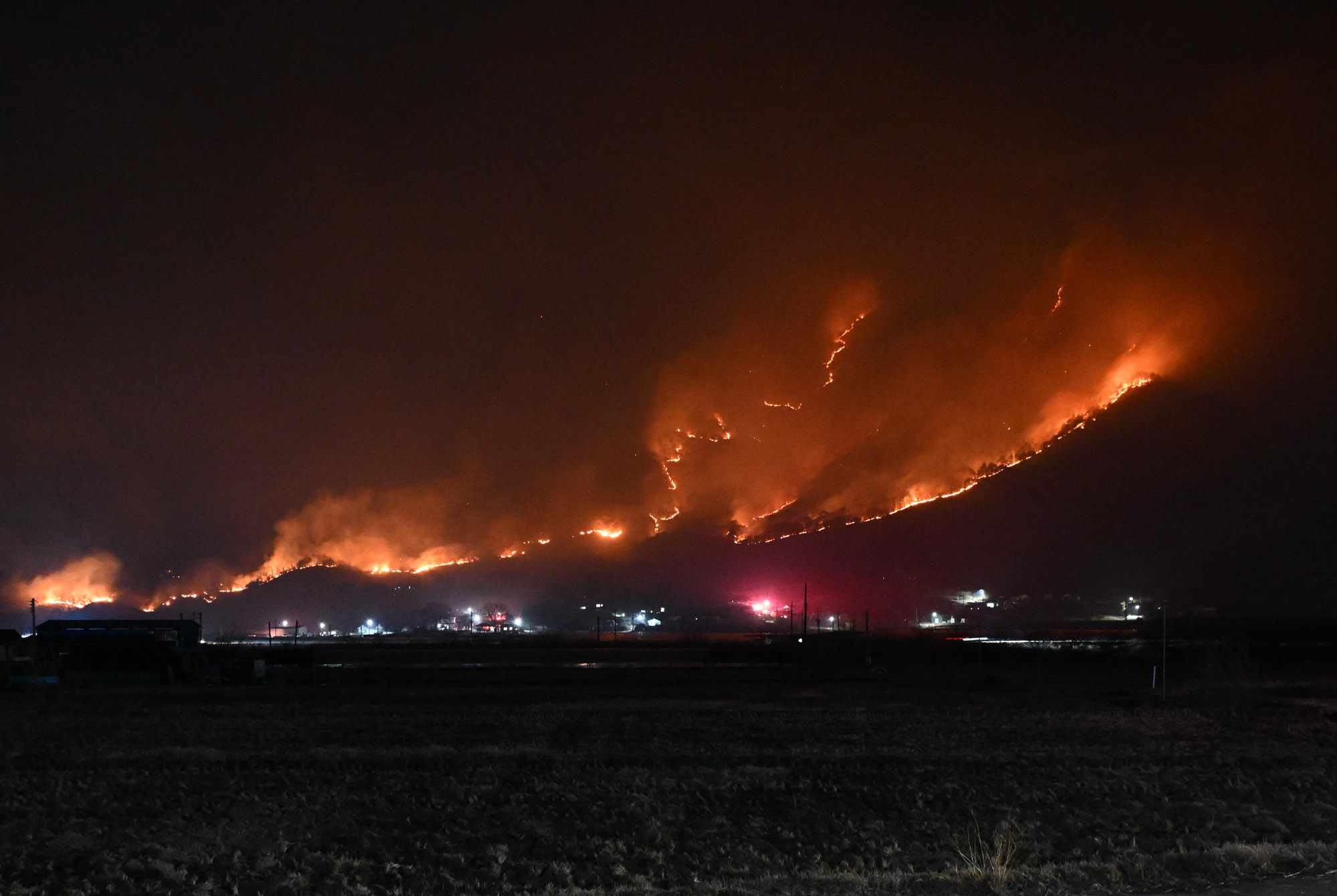 산청군 시천면에서 시작된(21일) 산불이 22일 산청군 단성면 자양리와 하동군 옥종면 두양리 경계지점까지 번져 불타고 있다. / 경남도민일보 제공