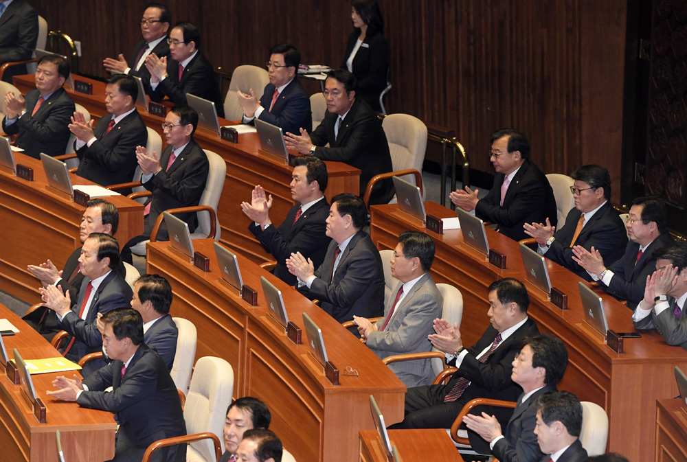 박근혜 대통령이 24일 오전 서울 여의도 국회에서 2017년도 예산안 및 기금운용계획안에 대한 정부의 시정연설을 하는 가운데 새누리당 지도부를 비롯한 당 의원들이 박수를 치고 있다.