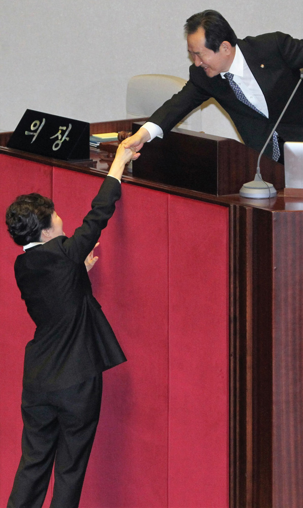 박근혜 대통령이 24일 오전 국회 본회의장에서 2017년도 예산안 시정연설을 마친 후 정세균 국회의장과 인사하고 있다. 2016.10.24 일요서울 정대웅 기자