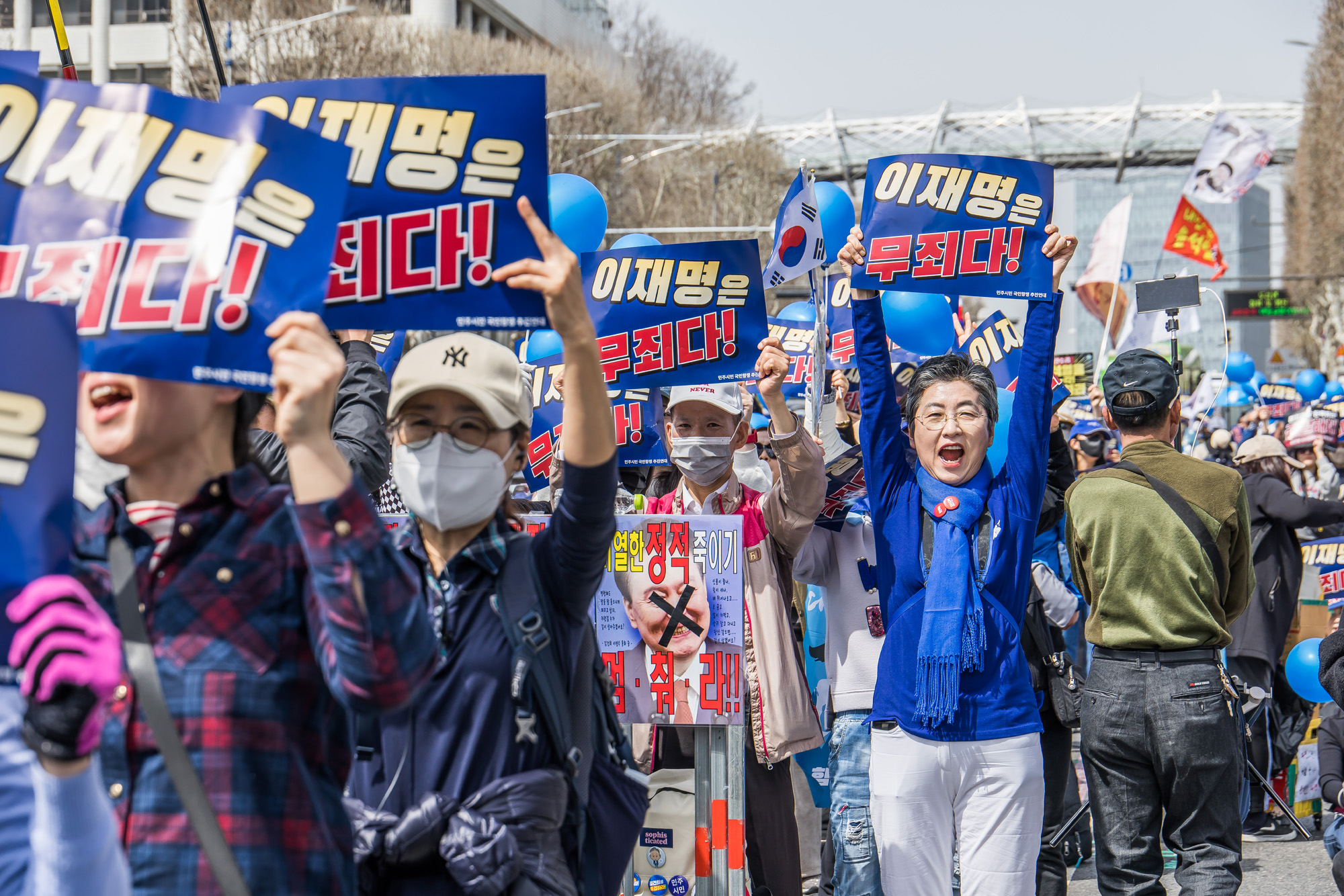 [서울=eoimage] 최준필 기자 = 더불어민주당 이재명 대표의 공직선거법 2심 선고 공판을 앞둔 26일 서울 서초구 서울중앙지방법원 인근에서 지지자들이 집회를 열고 있다. 2025.03.26. eomaster@eoimage.com