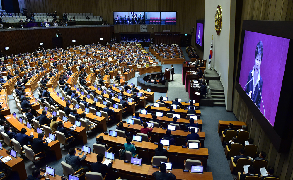아시아투데이 이병화 기자 = 박근혜 대통령이 24일 국회 본회의장에서 2017년도 정부 예산안 관련 시정연설에서 "임기 내에 헌법 개정을 완수하기 위해 정부 내에 헌법 개정을 위한 조직을 설치해서 국민의 여망을 담은 개헌안을 마련하도록 하겠다"고 밝히고 있다. /이병화 기자photolbh@