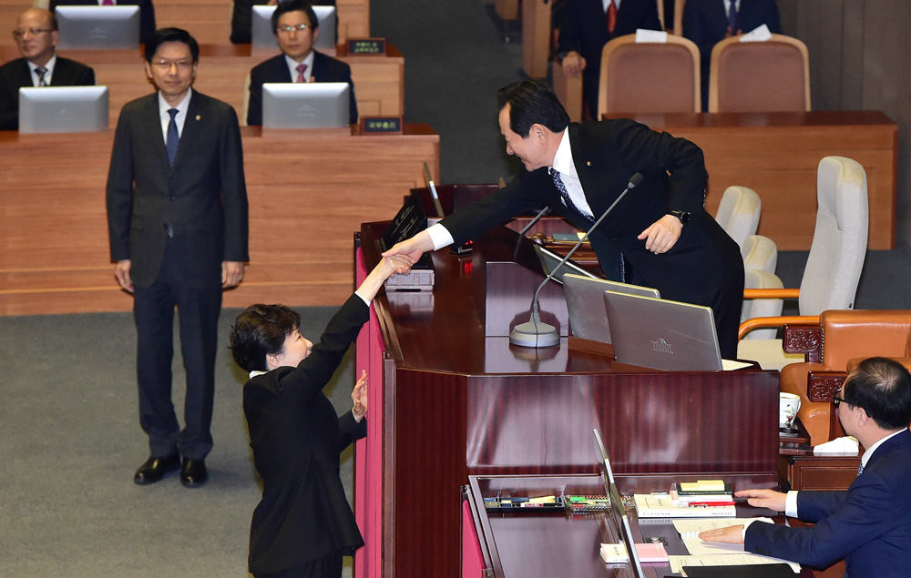 | 사진설명 | 아시아투데이 이병화 기자 = 박근혜 대통령이 24일 국회 본회의장에서 2017년도 예산안 시정연설을 마친 뒤 정세균 국회의장과 악수를 나누고 있다. 박 대통령은 이자리에서 "임기 내에 헌법 개정을 완수하기 위해 정부 내에 헌법 개정을 위한 조직을 설치해서 국민의 여망을 담은 개헌안을 마련하도록 하겠다"고 밝혔다. /이병화 기자photolbh@ |