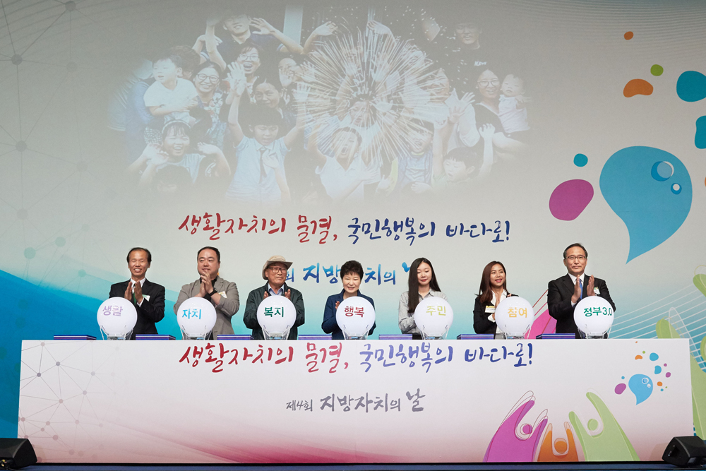 박근혜 대통령이 27일 오전 부산 벡스코에서 열린 제4회 지방자치의날 기념식에서 기념 퍼포먼스를 하고 있다.
