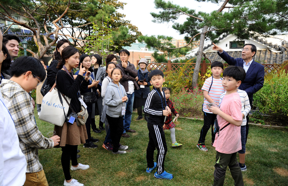 박원순 서울시장이 22일 오후 서울 가회동 시장공관에서 '제3회 북촌의 날 시장공관 투어' 일환으로 공관을 방문한 어린이와 시민들에게 내부 소개와 애장품을 공개하고 있다. 서울시 제공