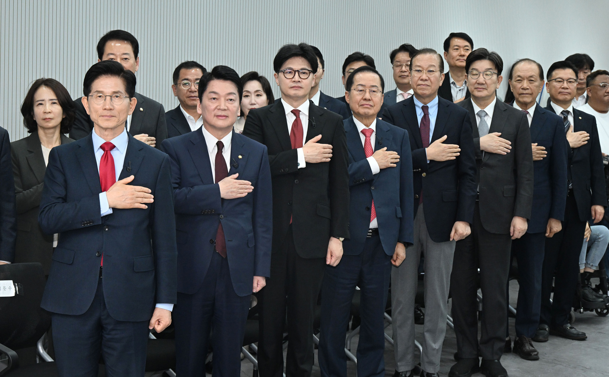 23일 서울 여의도 국민의힘 중앙당사에서 열린 2차 경선 토론회 미디어데이에서 국민의힘 김문수, 안철수, 한동훈, 홍준표 대선 경선 후보와 지도부들이 국민의례를 하고있다.