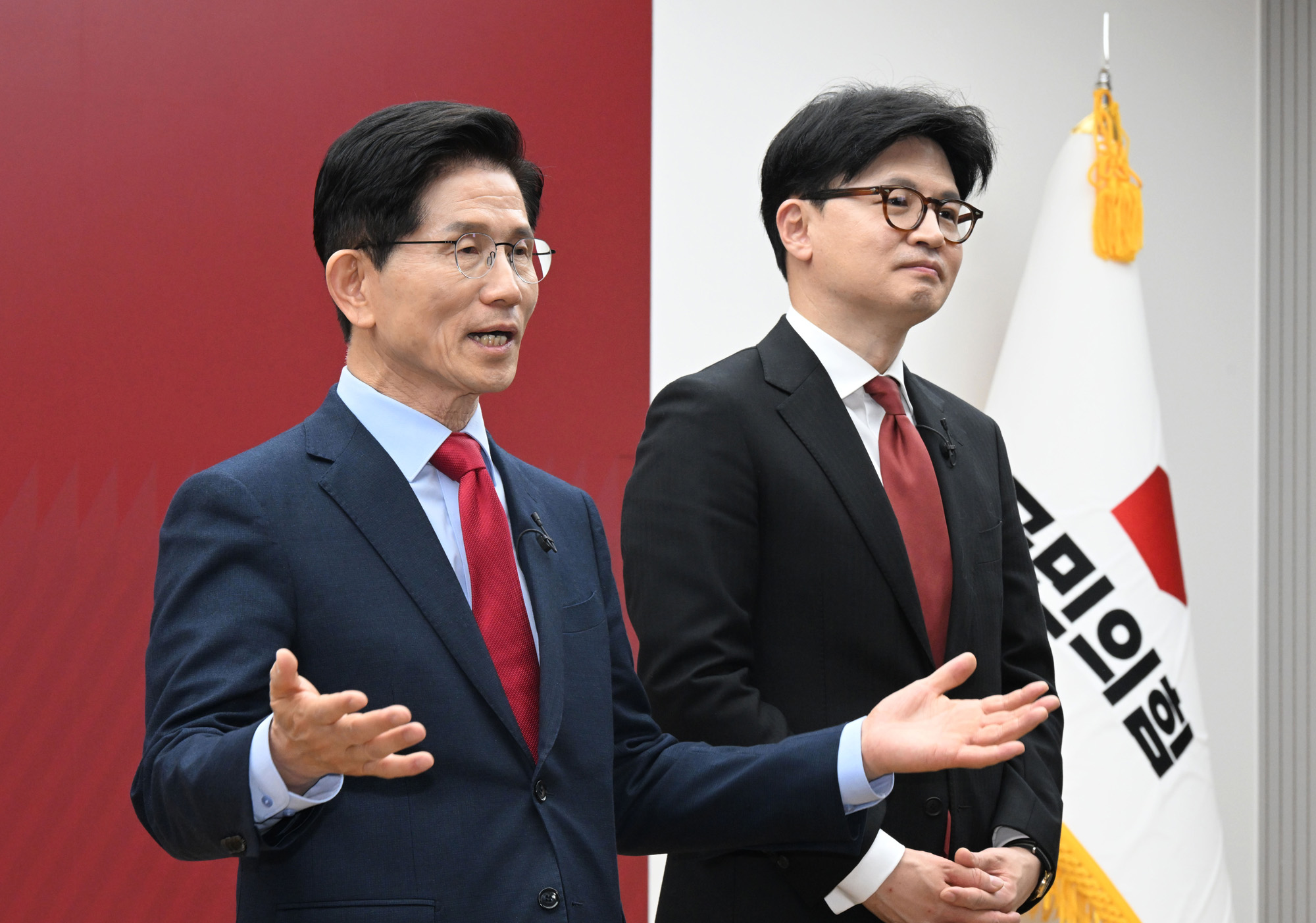 23일 서울 여의도 국민의힘 중앙당사에서 열린 2차 경선 토론회 미디어데이에서 국민의힘 김문수, 한동훈, 대선 경선 후보가 맞수 토론 대상으로 지명을 한후 발언하고 있다.
