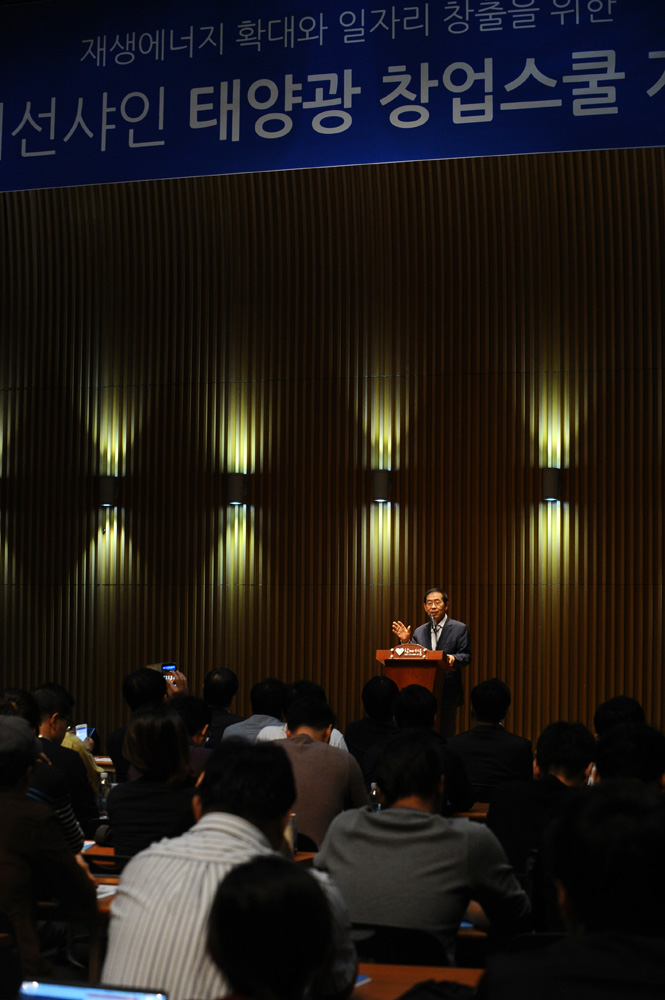 박원순 서울시장이 22일 서울시청 다목적홀에서 열린 '해피선샤인 태양광 창업스쿨' 개교식에서 축사하고 있다. 서울시 제공