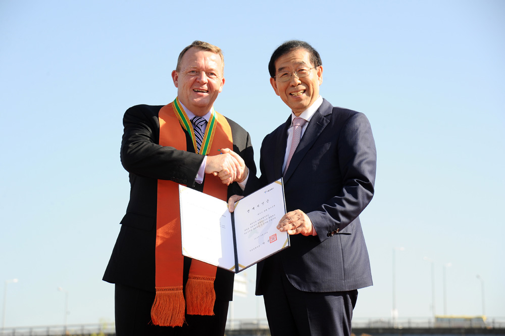 박원순 서울시장(왼쪽)과 라르스 뢰케 라스무센 덴마크 총리가 24일 오후 서울 여의도한강공원에서 '한강에서 만난 인어공주 동상' 제막식에 참석해 동상 앞에서 기념촬영 하고 있다. 서울시 제공