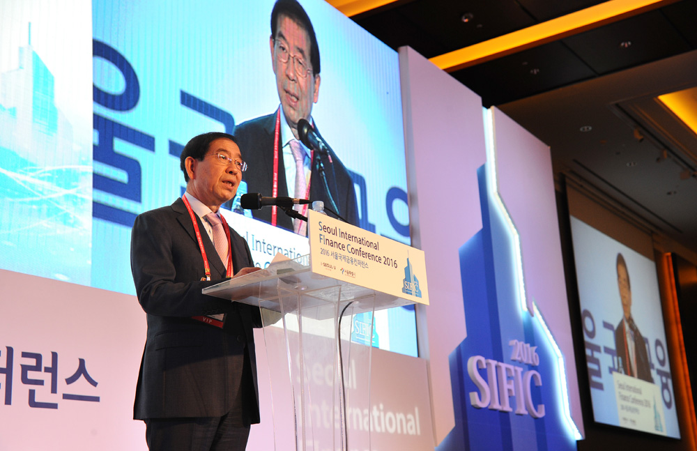 25일 오전 서울 여의도 콘래드서울 호텔에서 열린 2016 서울국제금융콘퍼런스에서 박원순 서울시장(왼쪽에서 3번째)이 참석자들이 기념촬영을 하고 있다. 서울시 제공