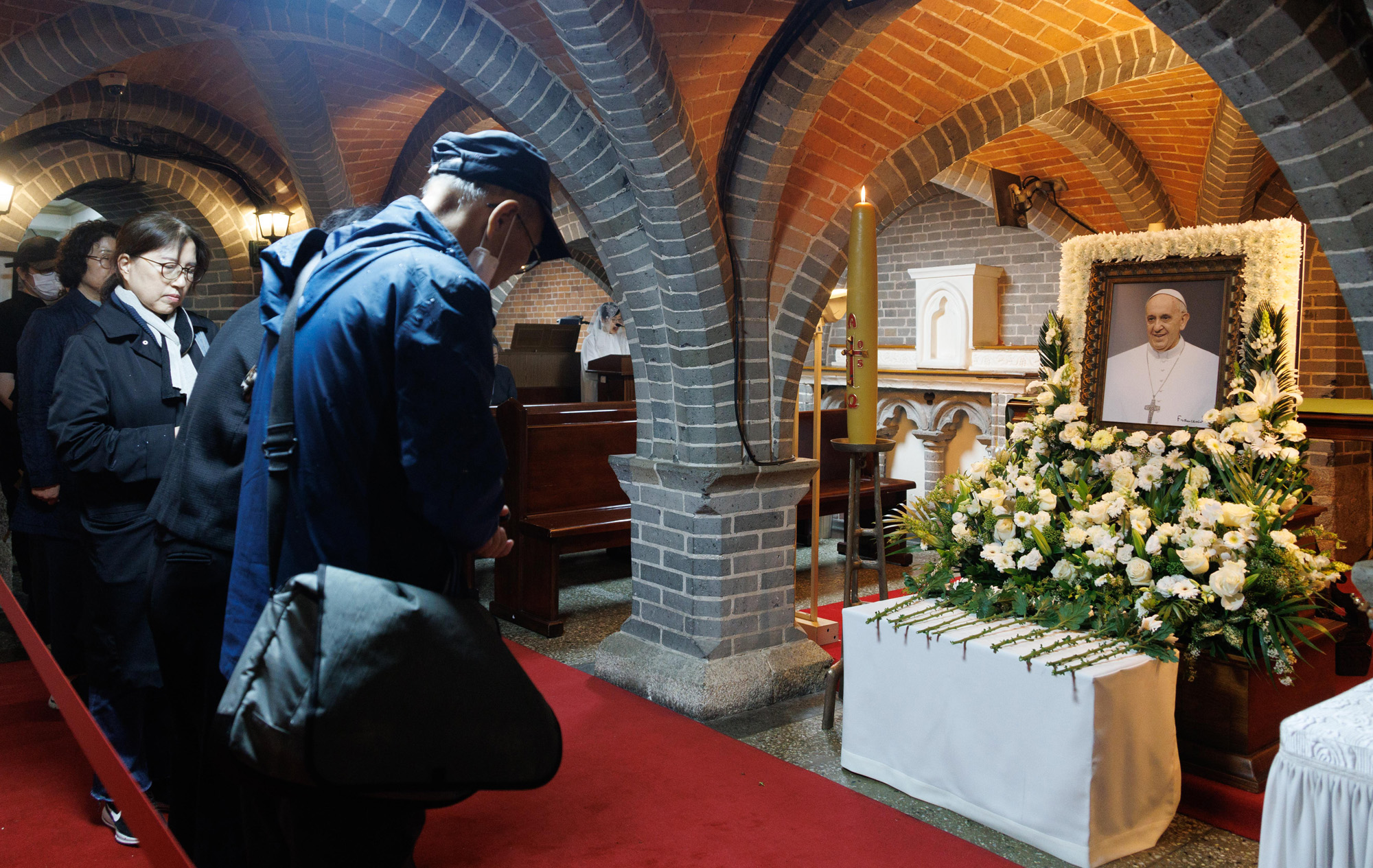 22일 오후 지난 21일(현지시간) 선종한 프란치스코 교황의 빈소가 마련된 서울 중구 명동대성당 지하성당에서 조문객들이 추모를 하고 있다. 2025.04.22 사진공동취재단