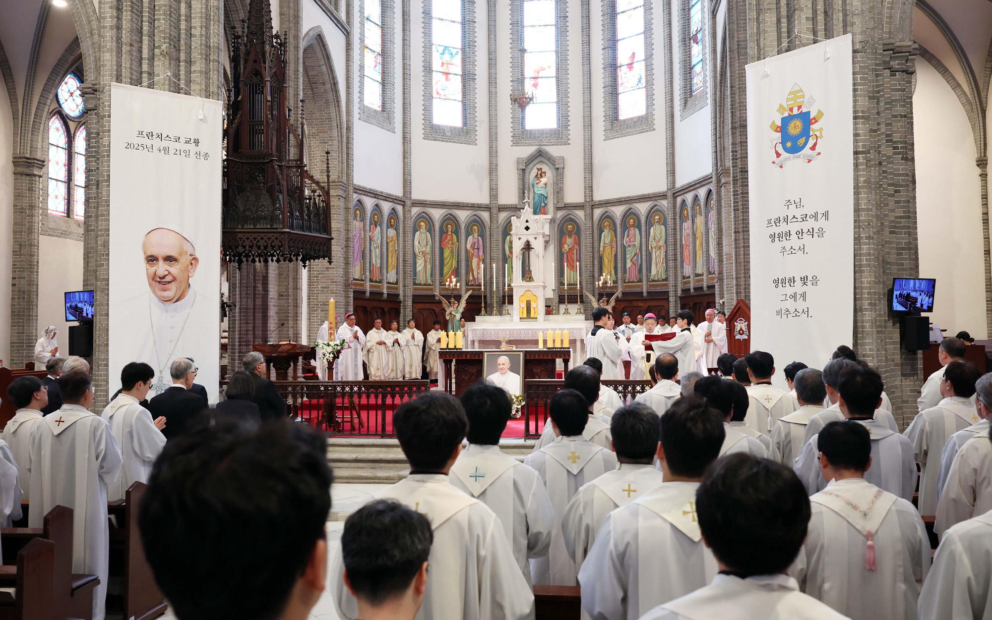 천주교 서울대교구장 정순택 대주교가 24일 오전 서울 중구 명동대성당에서 프란치스코 교황 추모 미사를 집전하고 있다. 2025.04.24. 사진공동취재단