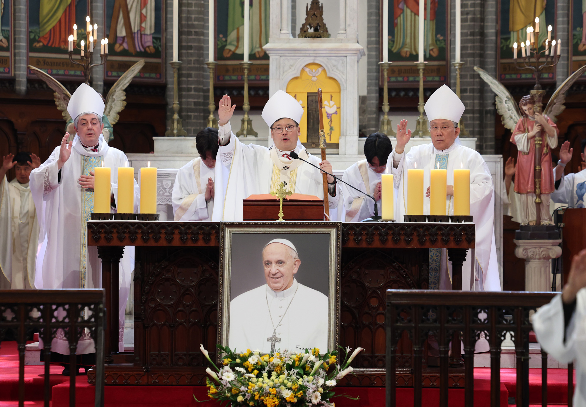 24일 오전 서울 중구 명동대성당에서 천주교 서울대교구장 정순택 대주교 주례로 프란치스코 교황 추모 미사가 거행되고 있다. 2025.04.24. 사진공동취재단