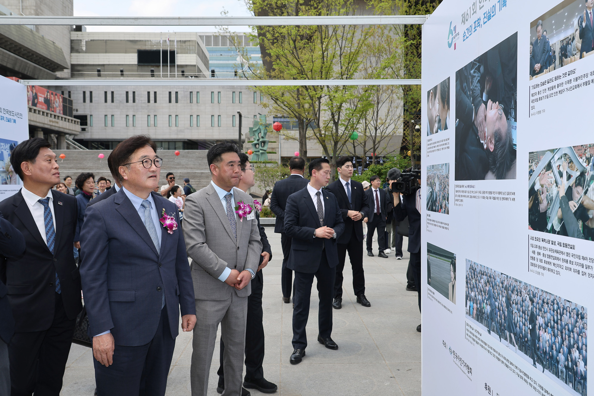우원식 국회의장이 21일 오전 서울 광화문광장 놀이마당에 개막한 제61회 한국보도사진전에서 이호재 한국사진기자협회장의 안내로 전시를 관람하고 있다. 전시는 24일까지 광화문광장 놀이마당에서 개막한다. (2024.04.21 사진공동취재단)
