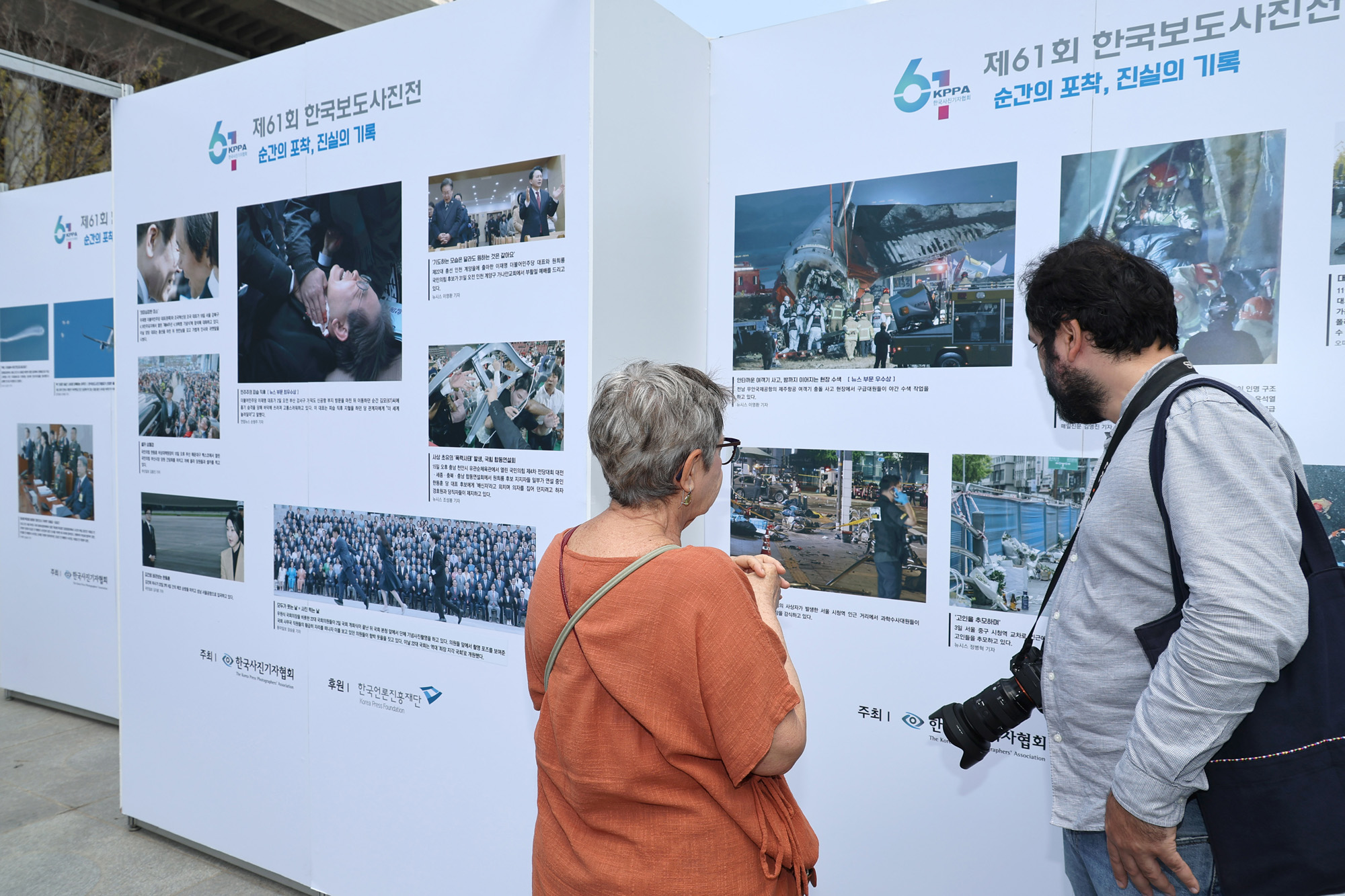 외국인 관광객들이 21일 오전 서울 광화문광장 놀이마당에 개막한 제61회 한국보도사진전을 관람하고 있다. 전시는 24일까지 광화문광장 놀이마당에서 개막한다. (2024.04.21 사진공동취재단)