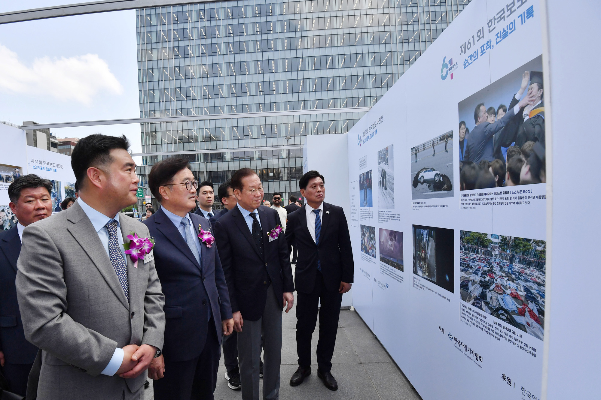 이호재 한국사진기자협회장, 우원식 국회의장, 권영세 국민의힘 비상대책위원장 등 내빈들이 21일 서울 종로구 광화문 광장에서 열린 제61회 한국보도사진전 '순간의 포착, 진실의 기록' 개막식에서 작품을 관람하고 있다. 2025.4.21 사진공동취재단