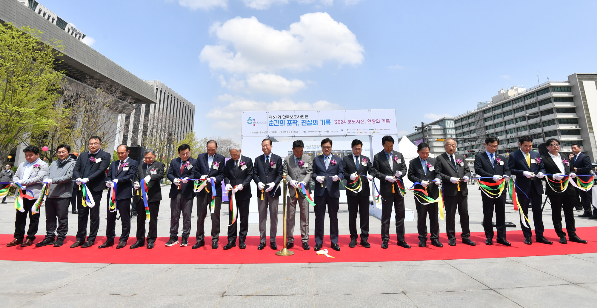 | 사진설명 | 21일 서울 종로구 광화문 광장에서 열린 제61회 한국보도사진전 '순간의 포착, 진실의 기록' 개막식에서 참석자들이 개막을 알리는 커팅식을 하고 있다. 왼쪽부터 한국사진기자협회 서재훈 부회장, 오세림 전북지회장, 양진수 인천지회장, 박정우 캐논코리아 대표, 홍준호 조선일보 발행인, 박종현 한국기자협회장, 김효재 한국언론진흥재단 이사장, 유인촌 문화체육관광부 장관, 권영세 국민의힘 비상대책위원장, 이호재 한국사진기자협회장, 우원식 국회의장, 박찬대 더불어민주당 대표 직무대행 겸 원내대표, 오세훈 서울시장, 이태규 한국신문방송편집인협회장, 장문기 한국보도사진가협회장, 최연송 한국영상기자협회장, 정해환 니콘이미징코리아 대표, 임열수 한국사진기자협회 경기지회장. 2025.4.21 사진공동취재단 |